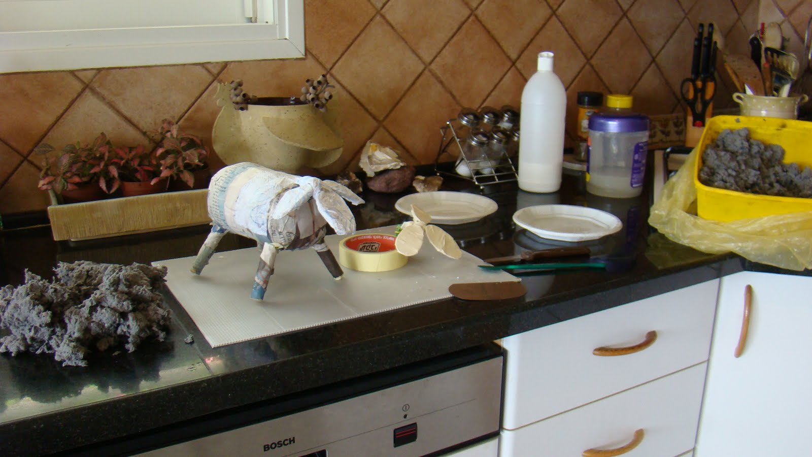And this is (was) the papiermache kitchen studio with some finished and some unfinished products! Warning: You better don't go into this - it is VERY addictive!! And for some weeks we did eat with the plates on our knees!!!